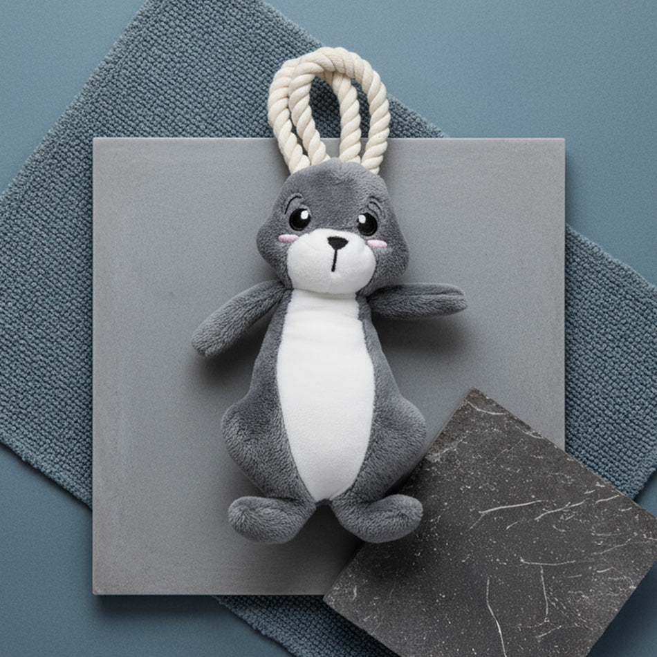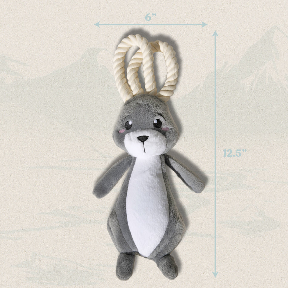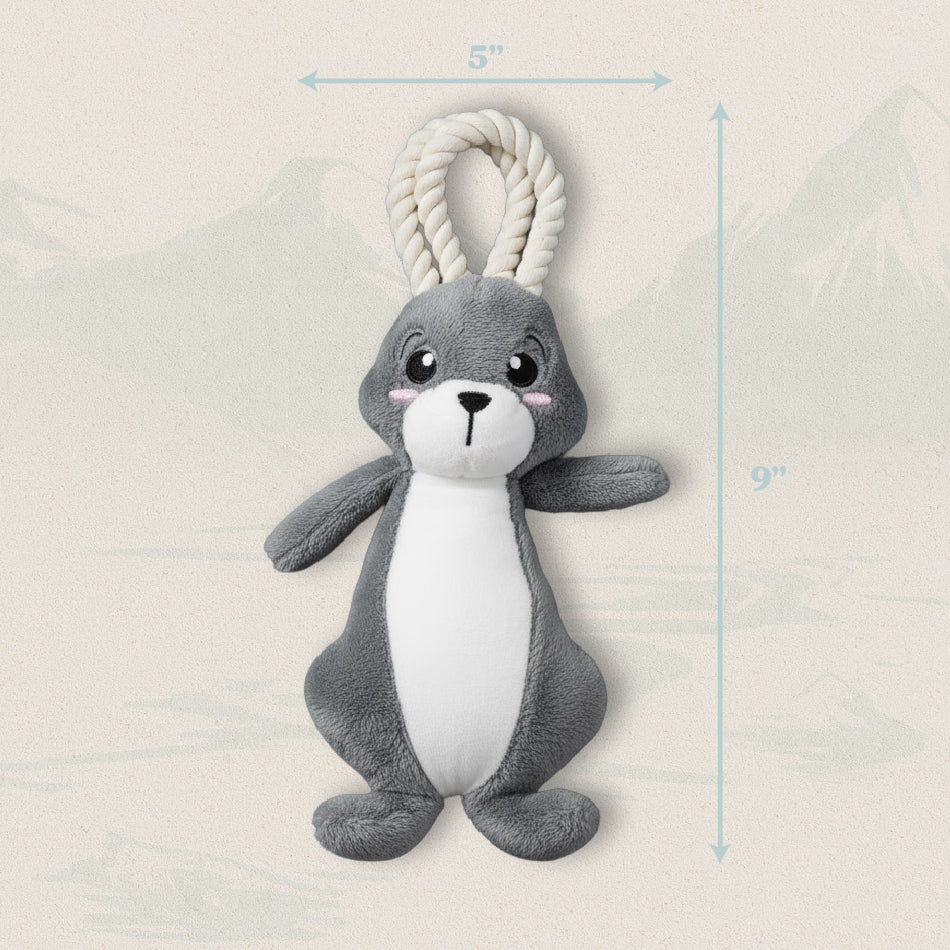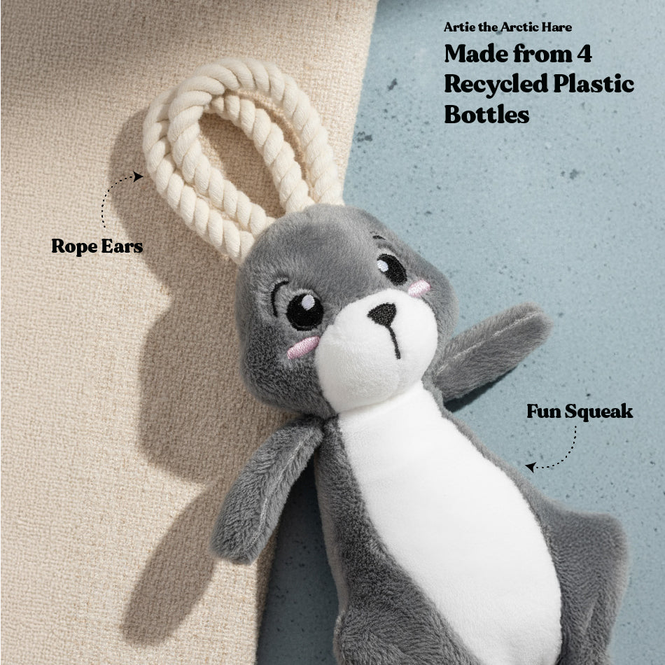 Hop into playtime with Artie the Arctic Hare! Featuring a squeaker and sturdy rope details, Artie makes every tug and toss game extra exciting. Made from 100% recycled plastic, he's a snowy sweetheart on a mission to save the planet, one plastic bottle at a time.