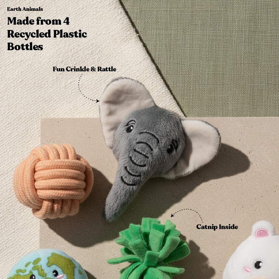 Earl the Elephant and his Earth Animals friends are ready to join the fun! With catnip, rattles, and crinkle material, this 5-pack will keep your cat pouncing and playing all day long. Made from 100% recycled plastic, these eco-friendly toys are as fun as they are sustainable.