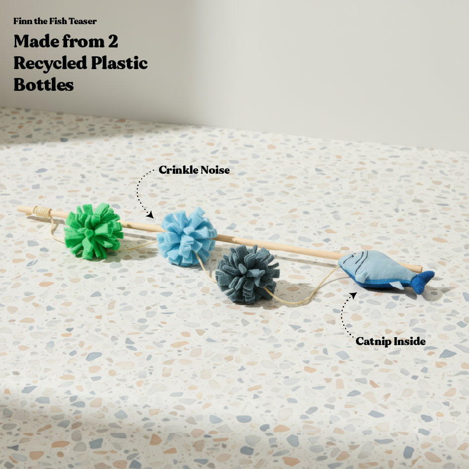 Finn the Fish Teaser is ready to reel your cat into fun! With catnip and crinkle noise, this teaser will keep your cat batting, pouncing, and kicking away. Made from 100% recycled plastic, Finn is as fun as he is planet-friendly.