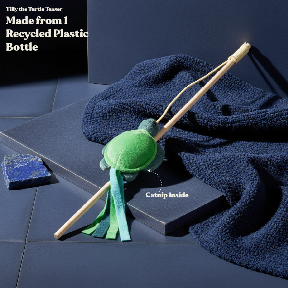 Tilly the Turtle Teaser is ready to swim into some playtime fun! With catnip and a dangly tassel tail, this teaser will keep your cat engaged and having a blast. Made from 100% recycled plastic, Tilly is as fun as she is planet-friendly.