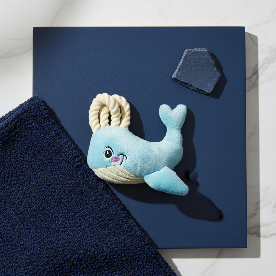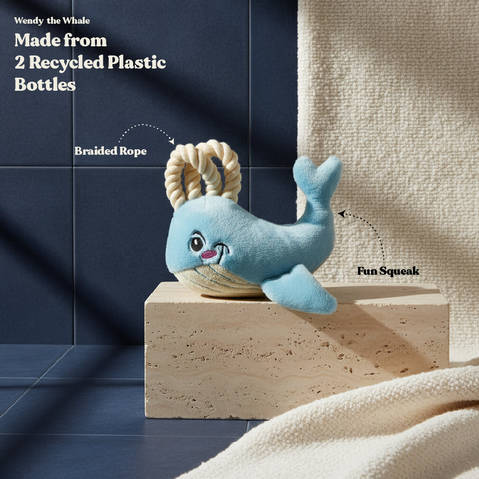 Wendy the Whale is making waves! With a squeaker for excitement and sturdy rope details, she's perfect for tugging, tossing, and hours of fun. Made from 100% recycled plastic, Wendy is a playful pal on a mission to save the seas!